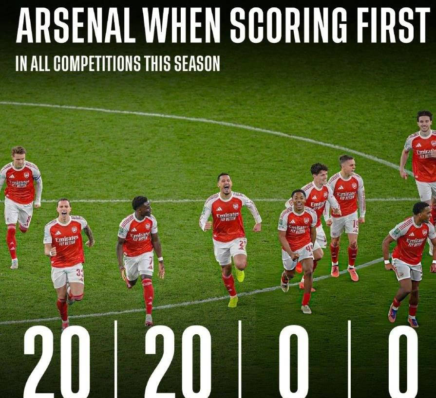 阿森纳本赛季制胜关键揭晓:率先进球赢球几率高达100%